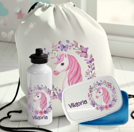 Vattenflaska, matlåda och gympapåse med namn