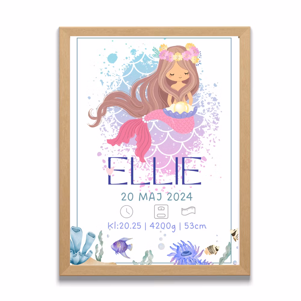 Med sitt motiv av en vacker sjöjungfru och sin personliga touch blir tavlan en tidlös och älskad dekoration. En personlig födelsetavla med sjöjungfru är inte bara en tavla – det är en känslomässig och stilfull gåva som firar livets stora stunder med en touch av magi och elegans.