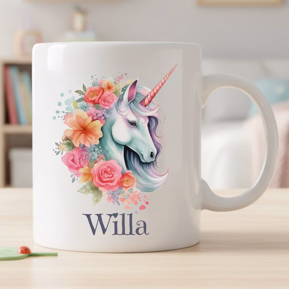 Gör varje måltid magisk med denna personliga barnmugg med namn och enhörningsmotiv!