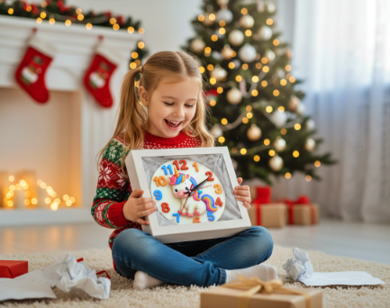 En magisk och tyst klocka under granen med barnets namn – en personlig present som uppskattas varje dag.