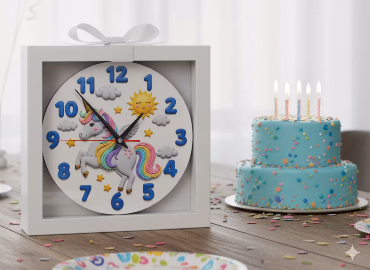 Skapa en sagolik känsla i barnrummet med denna unika och dekorativa enhörnings mönstrad barnväggklocka, som är både funktionell och fantasifull.